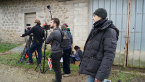 Sur les images, l’ensemble de l’équipe de tournage est accompagnée du propriétaire de la ferme, lieu de tournage principal du film.
